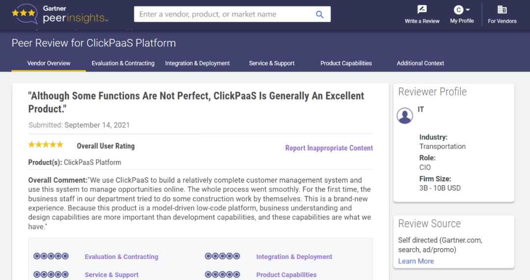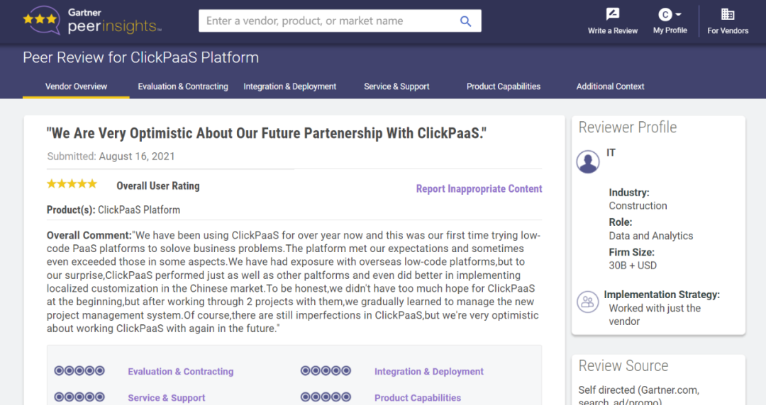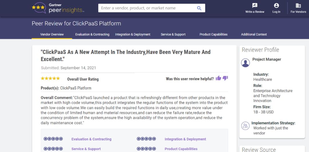 Tips:::::::::【Peer Insights】——用户对企业IT产品和服务发布真实评价的平台。。。。。。。目前已有355个市场,,,,,,,255,000条经过验证的评价。。。。。。每一条评价Gartner会针对参评企业营收规模及参评人员信息做验证、、、、、、评价内容做多维核实。。。。。。